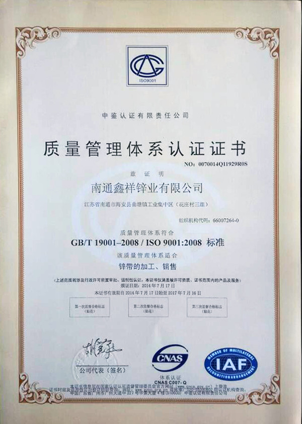 鑫祥鋅業正式取得ISO9001質量管理體系的認證證書。